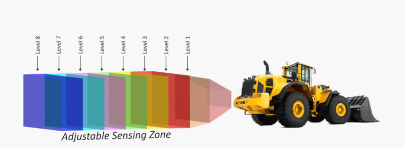The sensors emit fan shaped beams of high frequency microwaves and to minimize false alarms the sensors are configured to create a sensing area corresponding to the blind spot therefore ignoring objects outside that area. Alternatively, objects entering the sensing area alter the time delay of the return signal therefore prompting the system to signal visible and audible alerts to the operator through the indicator console installed in the cabin close to the operator. Additionally, an onboard camera and LCD monitor system allows the operator to visually check for obstructions instantaneously.